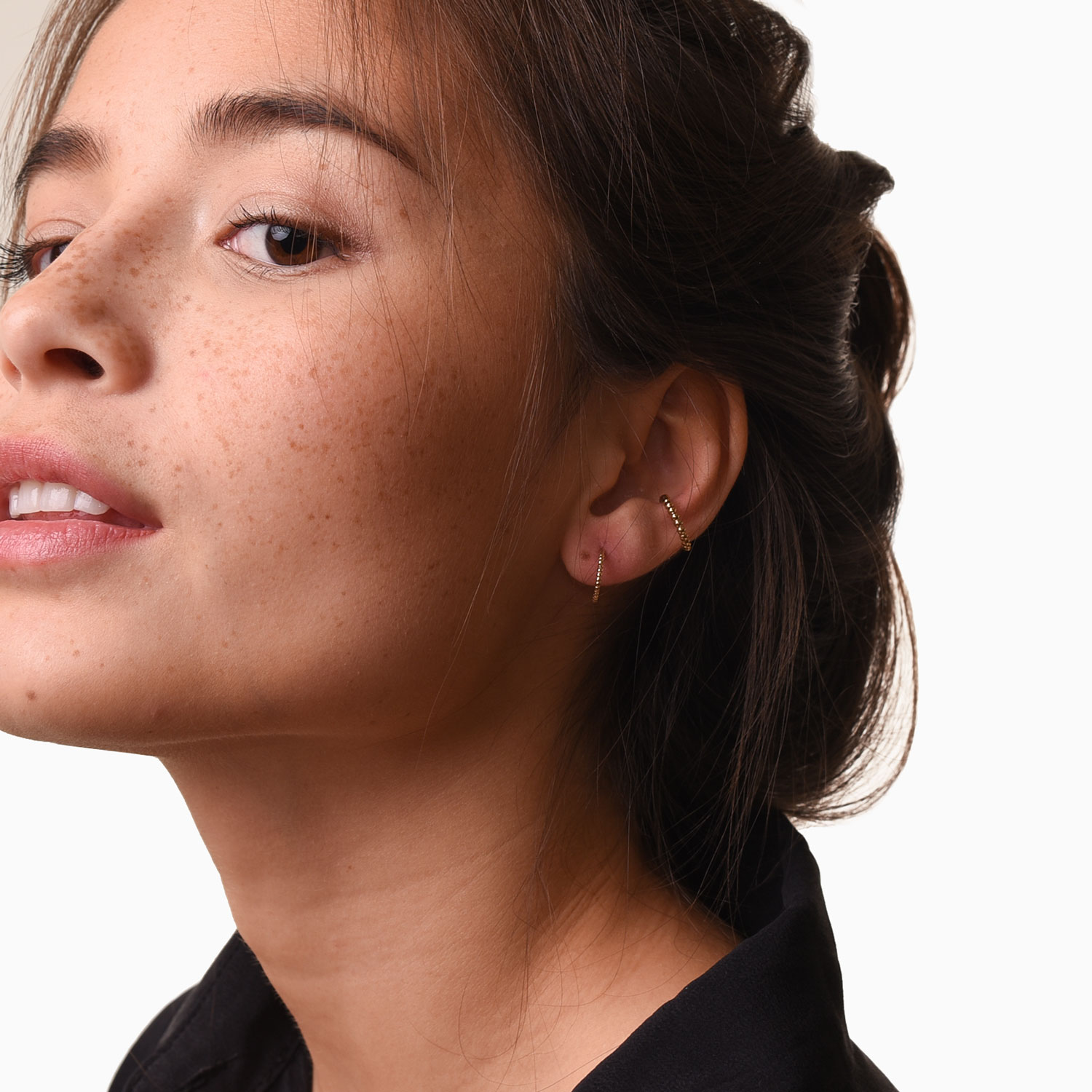 No piercing, no worries. You can commit to not committing, yeah, we said it. For an edgy, different look ?C put the Ear Cuffs on (stacked or alone) and head out. It’s as simple as that. Paired with the Beaded Hoops and Sleek Cuff.