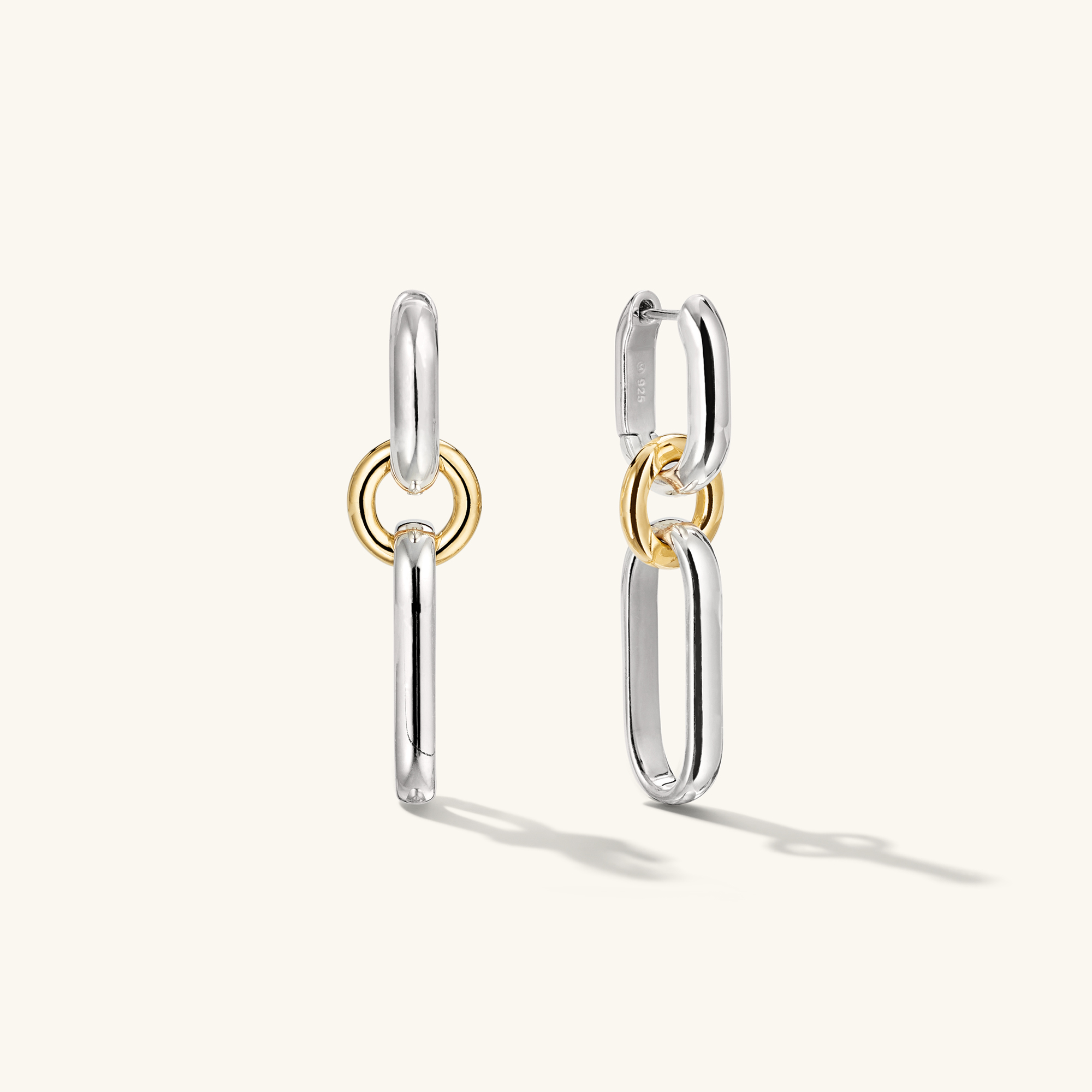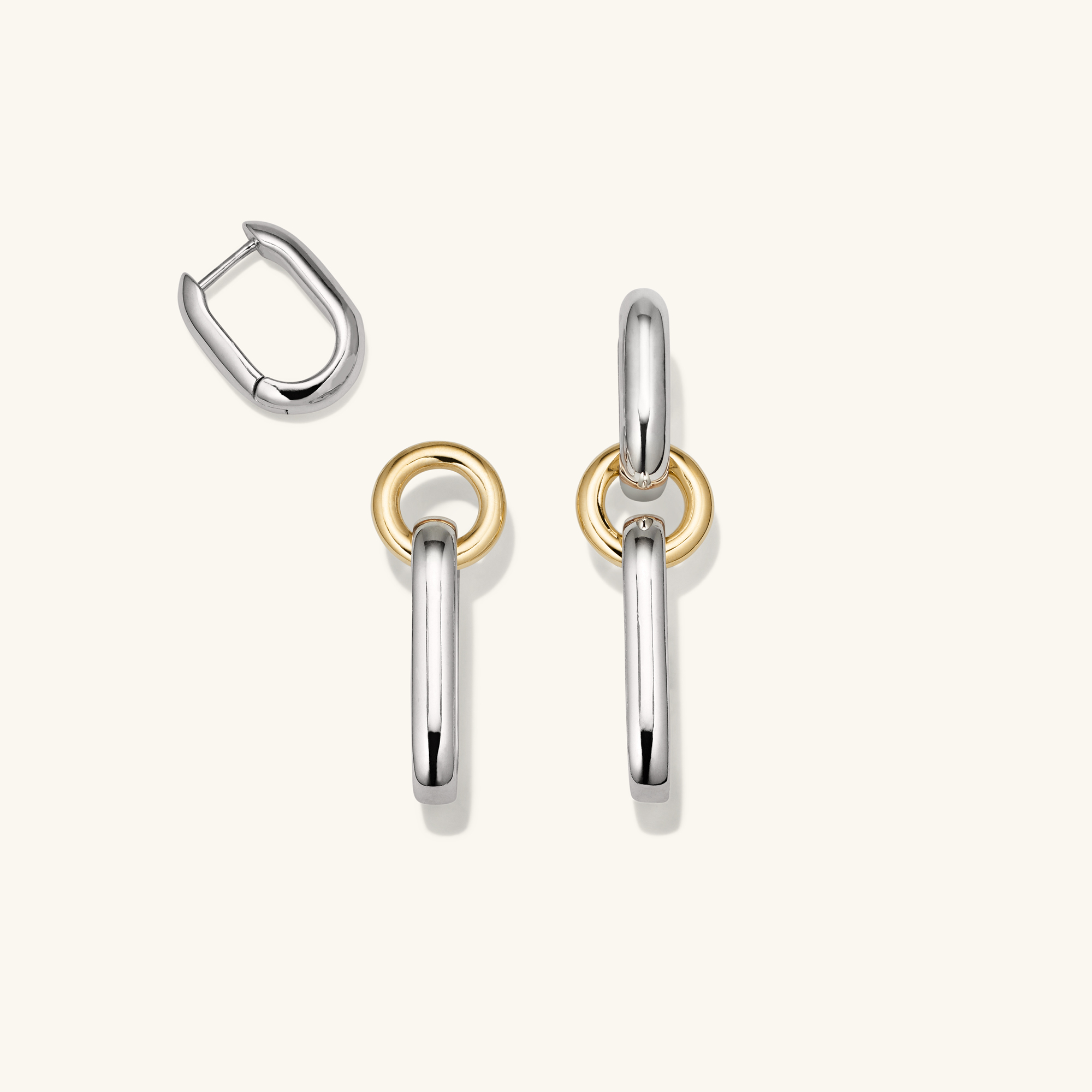 A lesson in duality featuring mixed metal links. Handcrafted in 18k gold vermeil and sterling silver. Have it your way with this versatile piece and style them as huggies or drop earrings.